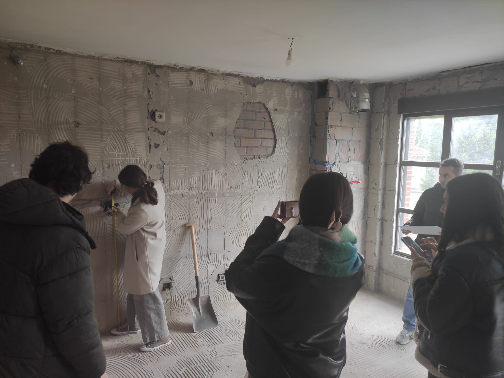 Durante la visita, el grupo llevó a cabo el levantamiento completo del estado actual del piso, un paso clave para el desarrollo de un futuro proyecto de reforma. La actividad comenzó con la toma de medidas tanto generales como detalladas de cada estancia, incluyendo muros, alturas, huecos, pilares y otros elementos singulares del espacio.